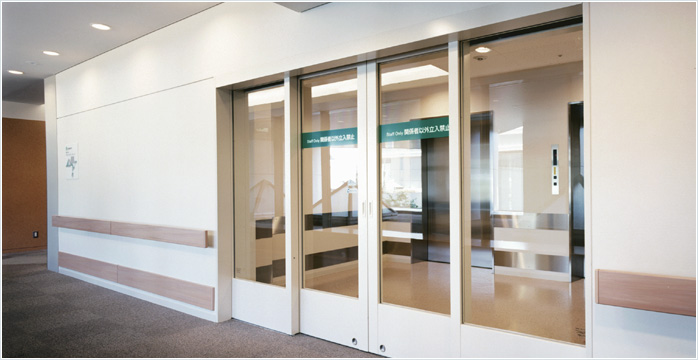 Adopting heat-resistant plate glass to ensure full transparency, these doors demonstrate solid fire resistance. Teraoka’s Specific Fireproof Facilities ensure a complete glass door installation while providing 60 minutes of fire resistance.