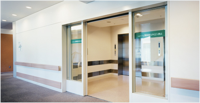Using heat-resistant plate glass, this door functions like any other automatic door. Its maximum opening is broad, conforming to the Heart Building Law ensuring smooth passage by wheelchair users.