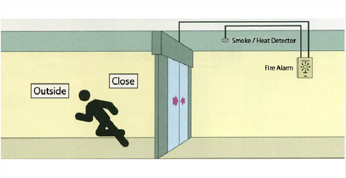- A fire alarm (smoke / heat detector) sends a signal to the connected control panel, which forwards it to the door controller, instructing it to automatically close the door. When evacuating, pressing the internal emergency ‘Open’ button will open the door and allow passage.
